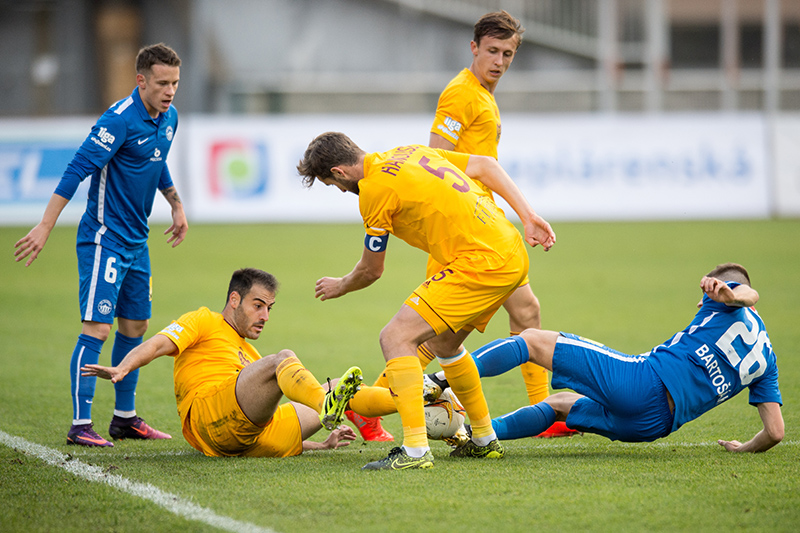 Utkání začalo ve svižném tempu. První příležitostí, jak ohrozit soupeřovu branku, se prezentoval v 8. minutě Néstor, jehož střelu z přímého kopu zablokovala hostující obrana na roh. Hosté se připomněli v 21. minutě. Baroš si naběhl za obranu a pálil k bližší tyči, kde však byl připravený gólman Rada. Hned vzápětí si na opačné straně narazil Néstor s Hanousekem a následná střela prvně jmenovaného proletěla kousek od pravé tyče. Velmi zajímavá část utkání pokračovala obří šancí Hanouska, který hlavičkoval v ideální pozici, ale hostující brankář Dúbravka předvedl parádní zákrok. Domácí fotbalisté měli v této fázi zápasu na svých kopačkách nejednu gólovou šanci. Jediné, co chybělo, byl gól. Obdobně dopadli ve svých příležitostech Beauguel, Tetour i Hanousek. Tlak domácích se s koncem poločasu ještě vystupňoval. Ve 43. minutě tlačil Bezpalec tvrdou střelu ze střední vzdálenosti ke vzdálenější tyči, ale těsně minul.