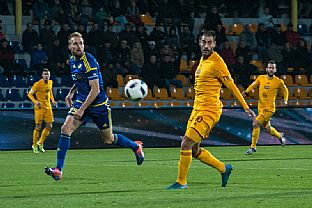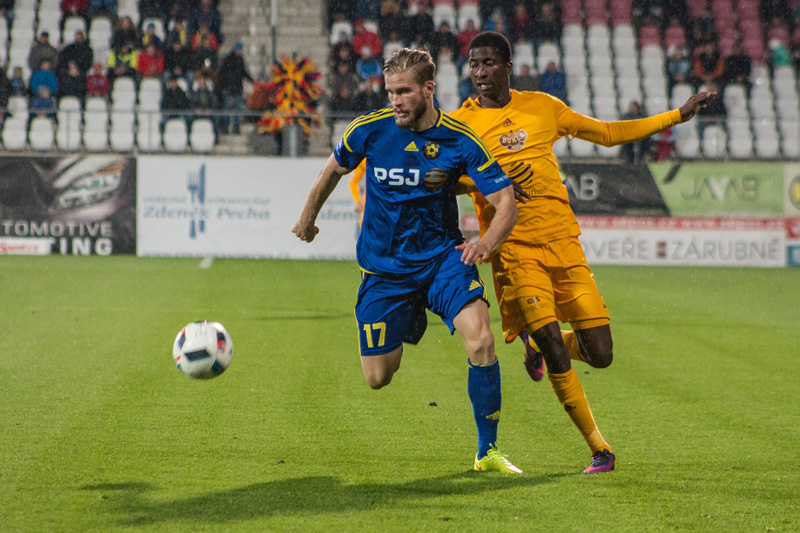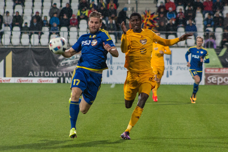 Sedmá minuta přinesla první zaznamenáníhodnou příležitost. Néstor chytře vysunul Olayinku, kterého před soupeřovým gólmanem na posledních chvíli zablokoval obránce Tlustý. Z dalšího útoku hostů vznikla obrovská možnost ke skórování. Po Preislerově centru zakončoval v pádu Považanec, od kterého se míč několikrát odrazil a Hanuš za pomoci tyče a velké dávky štěstí udržel bezbrankový stav. Dukla nadále pokračovala v povedeném vstupu do utkání. Juroška tváří v tvář brankáři Hanušovi dloubl do míče, ale ten skončil pouze na břevně. Další šancí na straně svěřenců Jaroslava Hynka se prezentoval Olayinka, který se sám před Hanušem pokoušel o jeho obstřel, bohužel bránu minul. Po půlhodině si svou první příležitost připsali i domácí. Na konci rychlého brejku mířil Michael Rabušic na vzdálenější tyč, ale minul přibližně o půl metru. Ve 36. minutě otevřeli skóre utkání fotbalisté Vysočiny. Centrovaný balon od rohového praporku prodloužil Štěpánek na zadní tyč, kde jej uklidil do brány Lukáš Zoubele. Před koncem poločasu vyslal Néstor krásnou střelu, kterou s vypětím všech sil vyrazil Hanuš na rohový kop.