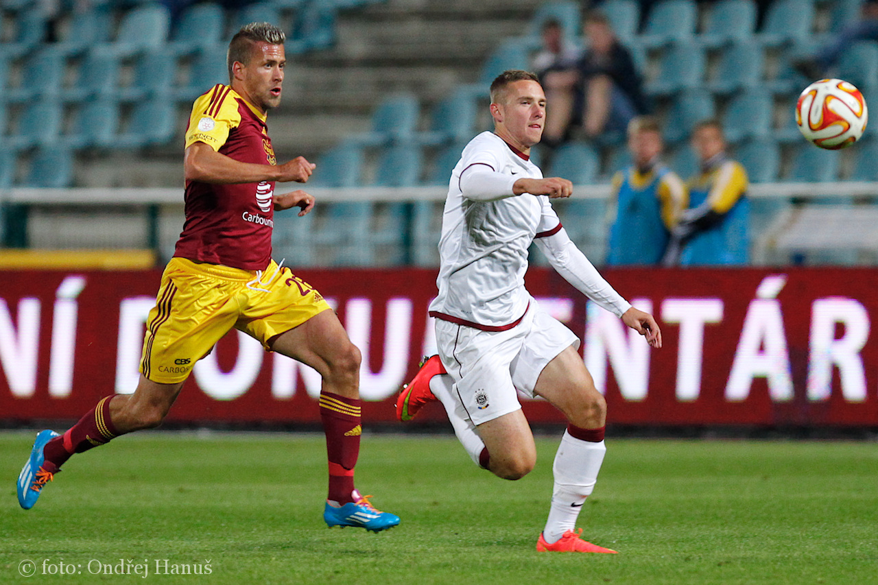 Dukla nastoupila do utkání v nových dresech, hráče tak můžeme opět vídat v barevné kombinaci, kterou oblékal například Josef Masopust.K první střele se probojovali právě domácí, Krmenčíkovi se po pravé straně povedlo utéct sparťanské obraně a vypálit, Bičík míč dobrým zákrokem vytáhl. V 16. minutě převzal Karavajev otěže plně do svých rukou, když prokličkoval přes celé hřiště až před bránu Bičíka, kde minul vzdálenější tyč. Nadějně vypadal i centr Matěje Hanouska, který dobře vystihl Krmenčík, ale jeho hlavička netrefila branku. Dvaadvacátá minuta už přinesla první branku, Marešovi dobře přihrál Považanec, jeho střílená přihrávka z levé strany doputovala až k TOMÁŠOVI BERGEROVI, který se nemýlil a otevřel skóre na 1:0. V závěru poločasu měl díky nedorozumění Chudého s obrannou Costa, ale přestřelil.