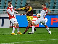 Do utkání vstoupila lépe Dukla, ze dvou závarů, které si vytvořila, však nedokázala skórovat. Po deseti minutách se hra postupně vyrovnala. V 16. minutě kopala Slavia rohový kop, míč šel na přední tyč, odkud byl prodloužen na zadní tyč kde se hlavou prosadil Dobrotka - 0:1. Vedení Slavii vydrželo pouze devět minut, ve 25. minutě se po přihrávce Matěje Hanouska prosadil Marek Hanousek, střelou ke vzdálenější tyči. Bohužel Slavia šla znovu do vedení už čtyři minuty poté a to střelou Škody. Nicméně ani domácí nezaháleli a už šest minut na to srovnal stav na 2:2 Jakub Považanec, který prošel na hranici vápna a propálil Rakovana střelou k tyči.