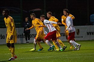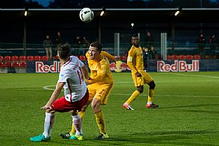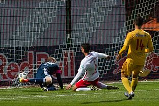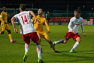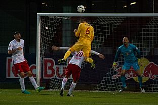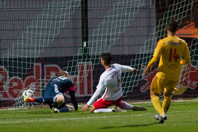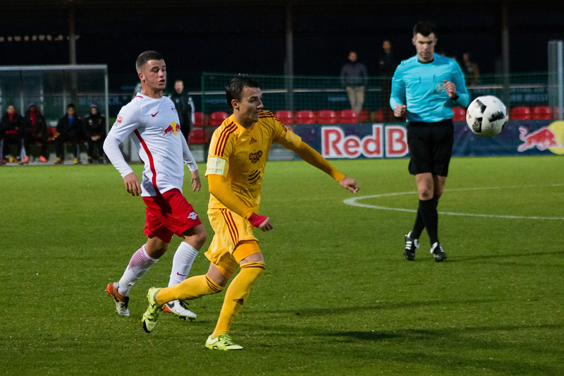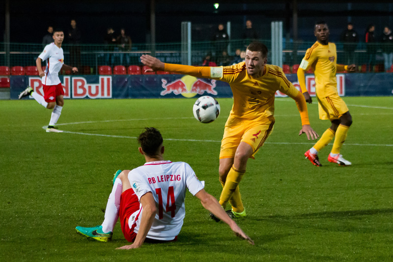 Dukla nastoupila do utkání proti RB Lipsko aktivně. V samotném začátku se do příležitosti dostal Manzia, jeho střela ale mířila nad branku. To ale neplatilo v případě jeho druhé střely. V 8. minutě mu poslal pěknou přihrávkou míč Néstor a Bidje Manzia střelou z osy hřiště poslal Duklu do vedení 1:0. Dukla byla více na míči než domácí, kteří naopak hrozili z rychlých protiútoků. Ve 14. minutě vypálil na Hroššovu branku kapitán Dominik Kaiser a nemýlil se. Nebezpečná střela přišla od stejného hráče ve 24. minutě, ale Hroššo si s ní poradil. Bohužel o tři minuty později se domácí radovali podruhé. Rani Khedira zvýšil domácí vedení na 2:1. V poslední patnáctiminutovce měla Dukla dvě šance, nejdříve hlavičkoval Juroška, míč letěl nad branku. Podruhé pálil Néstor těsně vedle.